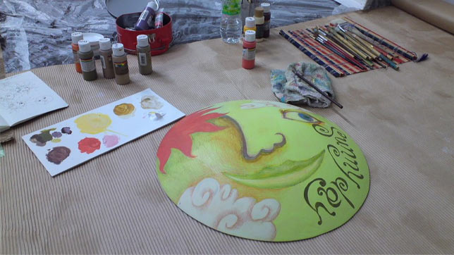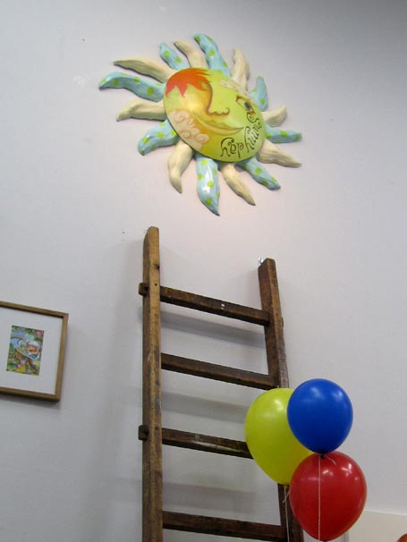ここは天井が高く、壁も直接描いたり釘うったり吊したり